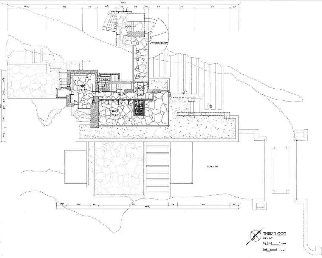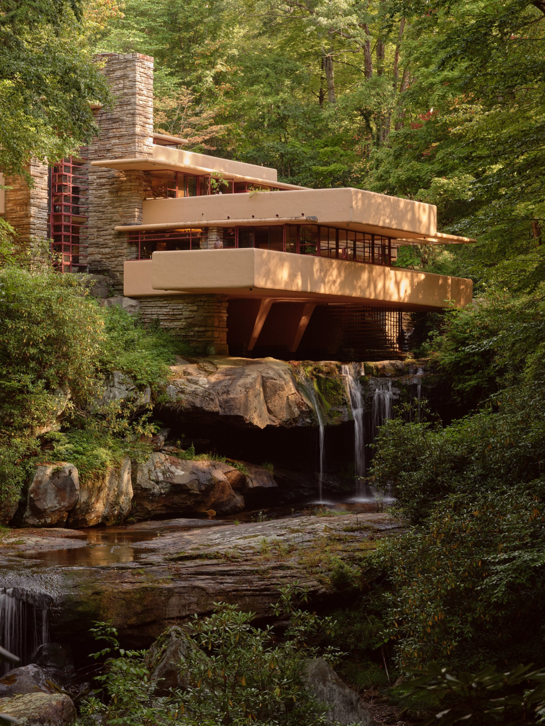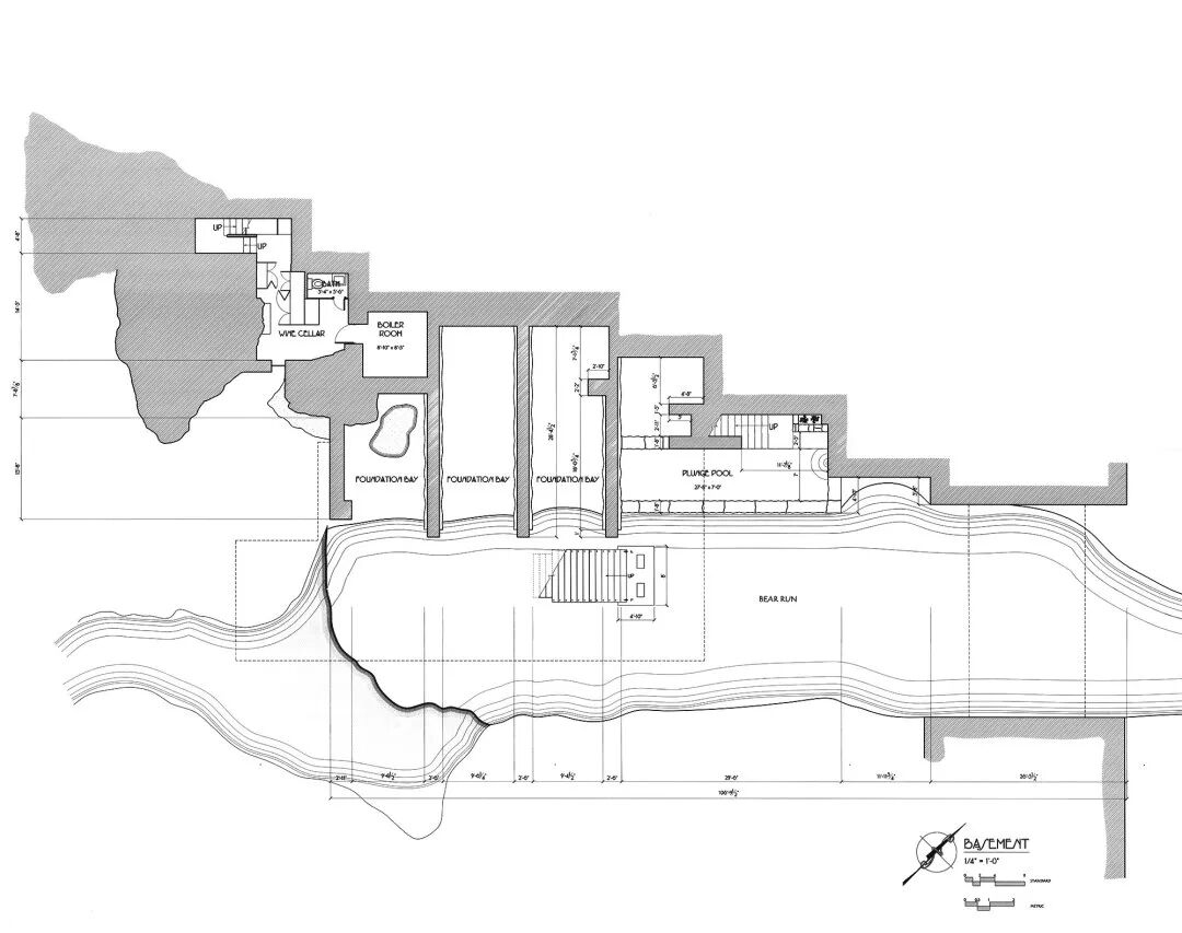 流水别墅坐落于一片私人承包的林地之间,选址原来在瀑布对面,赖特希望建筑能与瀑布共存,于是有了现在的布局。赖特用互补的平衡代替对称的讨论,横向的线条、缓坡屋顶、毛石墙面与混凝土混合、横向长窗、转角窗、就地取材等特征都得到延续。同时,流水别墅坐落在溪流上面、与山势相融合的布局,使之成为最能体现赖特有机建筑观点的宅邸。