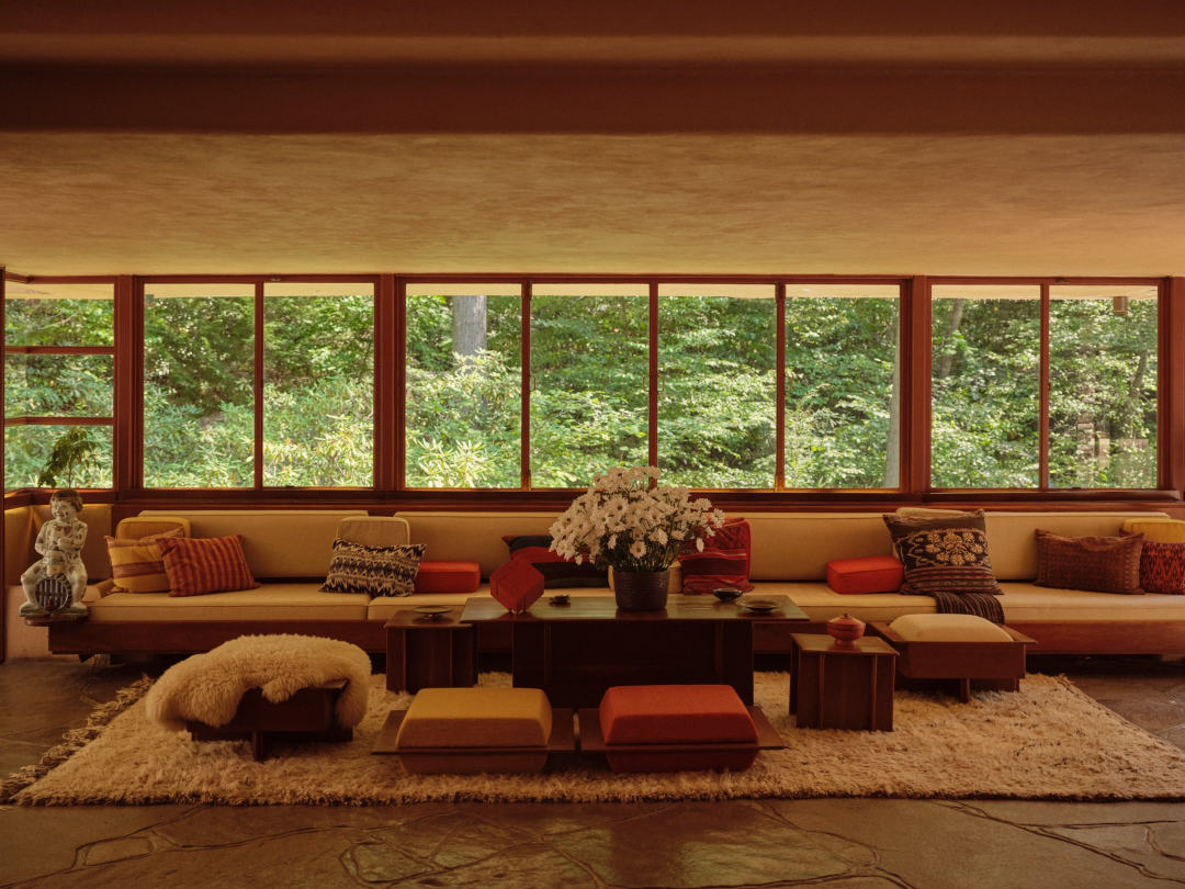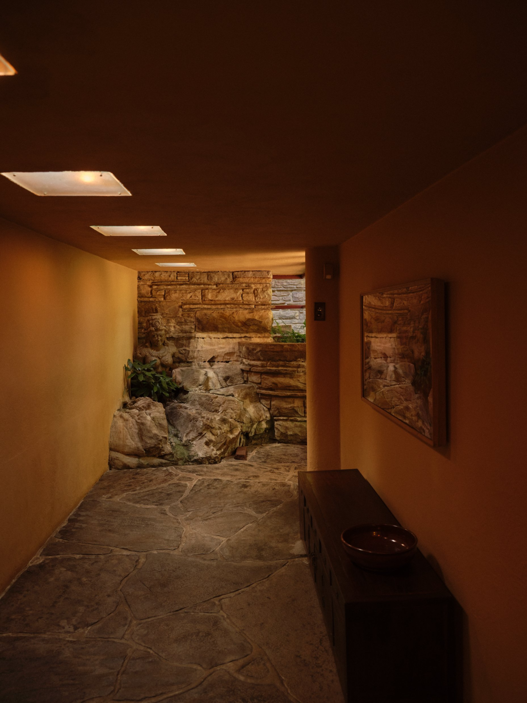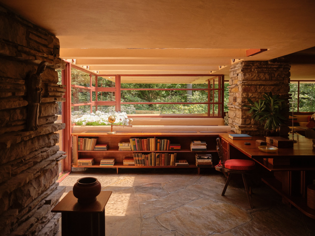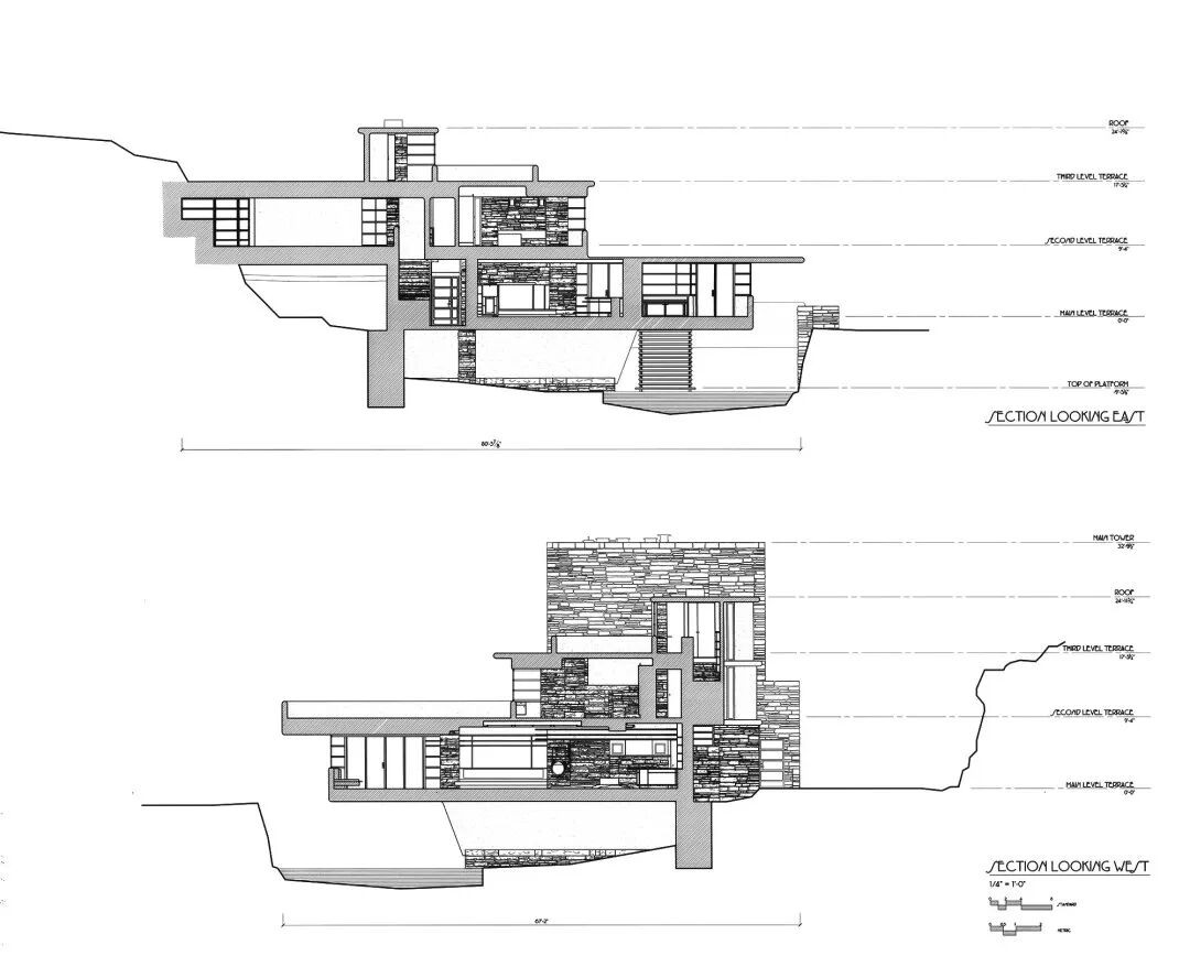 流水别墅坐落于一片私人承包的林地之间,选址原来在瀑布对面,赖特希望建筑能与瀑布共存,于是有了现在的布局。赖特用互补的平衡代替对称的讨论,横向的线条、缓坡屋顶、毛石墙面与混凝土混合、横向长窗、转角窗、就地取材等特征都得到延续。同时,流水别墅坐落在溪流上面、与山势相融合的布局,使之成为最能体现赖特有机建筑观点的宅邸。