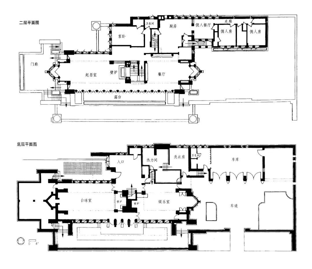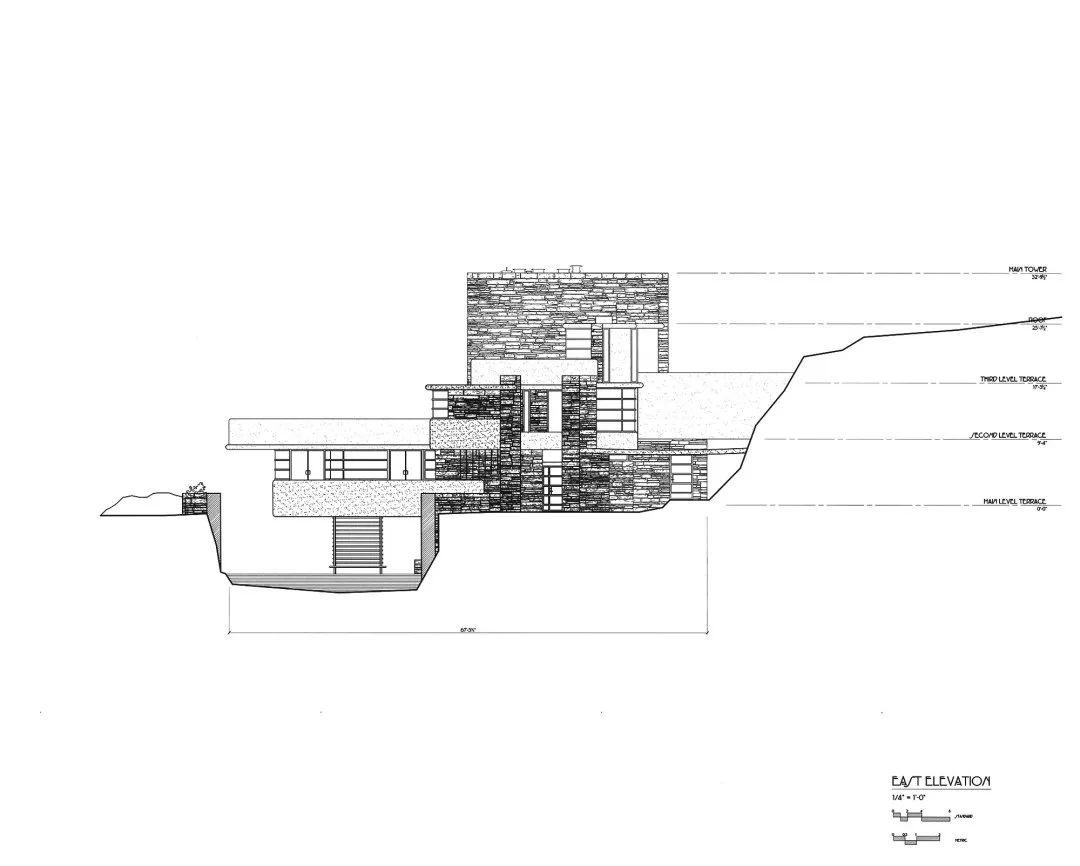1909年的赖特自宅”东塔里埃森“是草原住宅理论的集大成者,建筑坐落在缓坡上,四周环布美景,赖特采用了非对称的浪漫的建筑手法诠释他的建筑观点。罗比住宅的舒缓的四坡屋顶、深远的挑檐、强有力的烟囱体量、长条的平开窗和流动的室内空间等草原住宅特征都被传承。赖特在建筑布局上结合基地山地特征依山而布,大胆选取当地材料,石料来自1英里开外的采石场,木材来自周边的森林,抹灰的原料取自山下河边平坦的沙地,铺垫了后来的流水别墅就地取材建造方式。